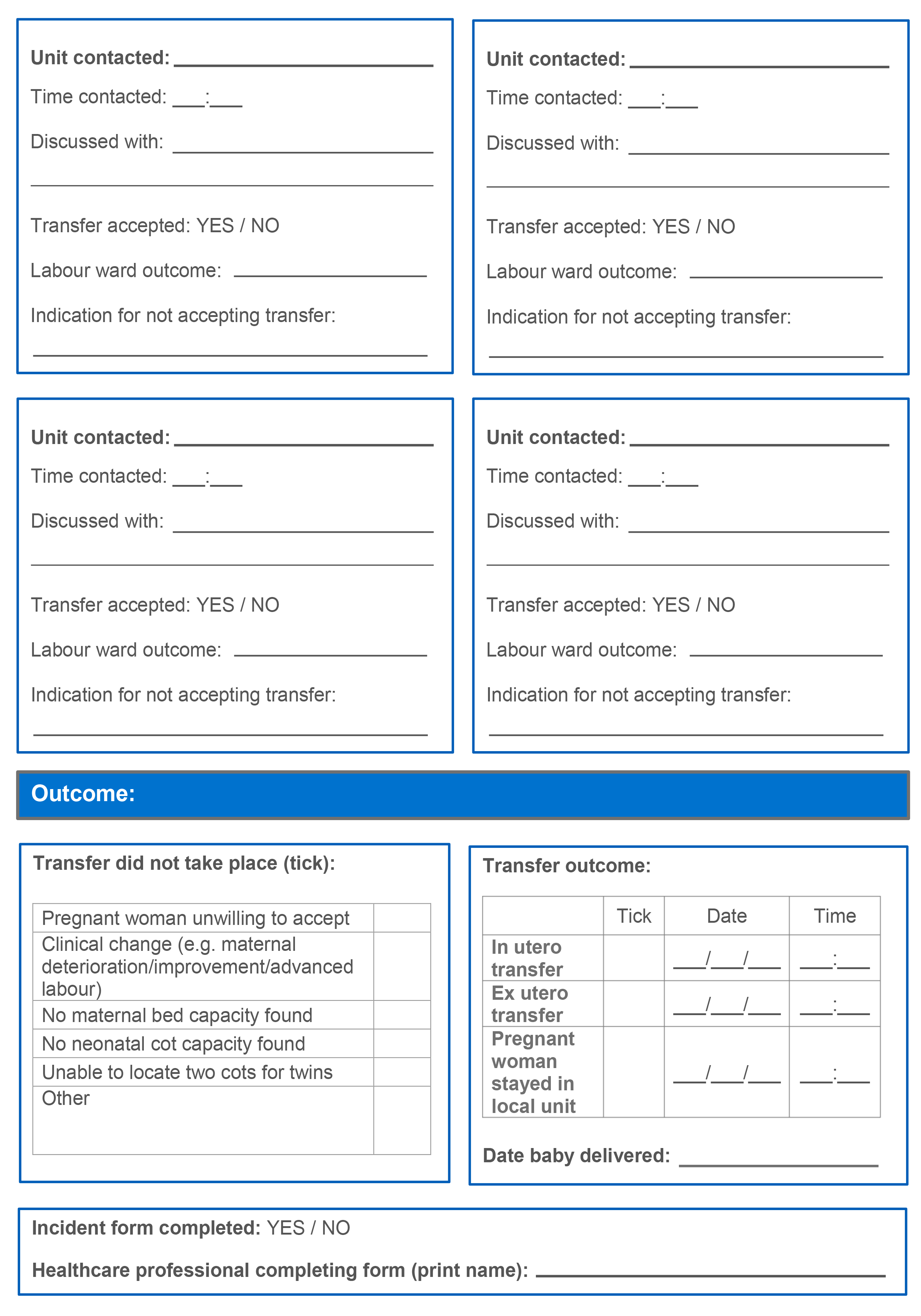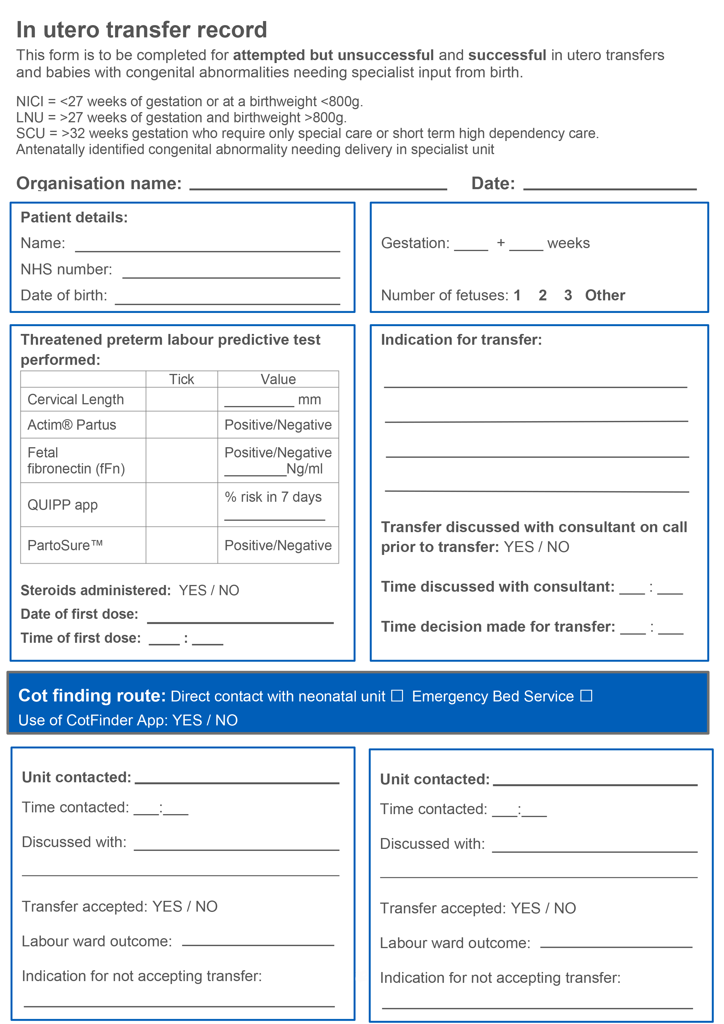 It is recommended that all Local Maternity Systems (LMSs) have an agreed ‘in utero transfer record’ document which should be completed in all instances of attempted transfer. A copy should be kept in hospital clinical notes and a copy sent to local maternity clinical governance leads. An example of this document can be found in appendix E.